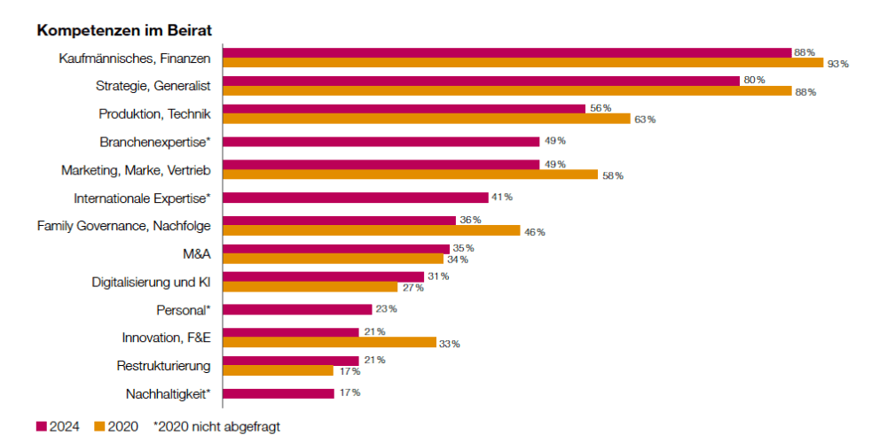 Eine positive Entwicklung lässt sich dennoch in Bezug auf die breite Fächerung der Kompetenzen feststellen. Während früher kaufmännisches Wissen und strategisches Know-how dominierten, hat sich das Kompetenzspektrum der Beiräte in den letzten Jahren erweitert. Heute verfügen 88 Prozent von ihnen über kaufmännisches und 80 Prozent über strategisches Wissen. Gleichzeitig ist das Fachwissen in Bereichen wie Produktion und Marketing zwar noch stark vertreten (56 Prozent und 49 Prozent), hat jedoch an Bedeutung verloren, während Kenntnisse in Digitalisierung, Restrukturierung und internationaler Expertise an Gewicht gewinnen.