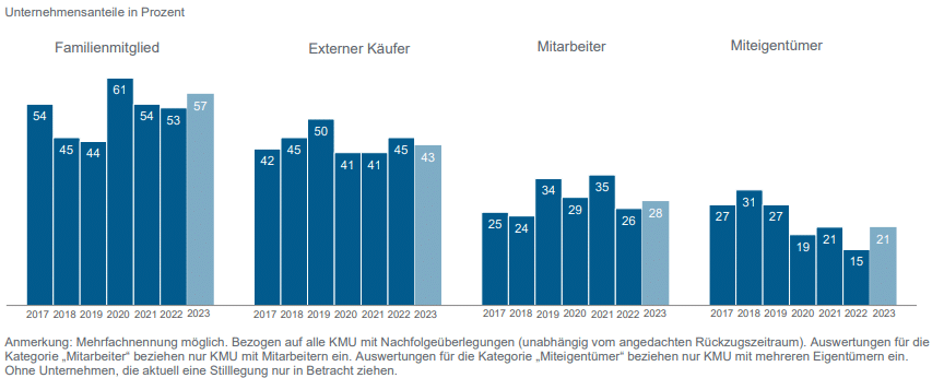 Es gibt viele Gründe, warum Familienmitglieder für die Nachfolge nicht infrage kommen. Dazu gehören mangelndes Interesse oder es bestehen individuelle Karrierewünsche, die mit einer Unternehmensübernahme nicht vereinbar sind. Steht kein geeigneter Nachfolger oder keine geeignete Nachfolgerin zur Verfügung, rücken Überlegungen zu Betriebseinstellungen in den Fokus. Besonders ein fehlender Nachfolger oder eine fehlende Nachfolgerin stellt viele Unternehmen vor eine ihrer größten Herausforderungen. Dieser Druck wird durch den demografischen Wandel verstärkt, da anzunehmen ist, dass der Nachfolgeengpass in den kommenden Jahren weiter zunehmen wird. Dennoch bleibt der Wunsch einer familieninternen Nachfolgelösung weiterhin hoch. Alternativ gewinnt laut KfW-Research die externe Nachfolge durch einen Verkauf zunehmend an Bedeutung und liegt bereits an zweiter Stelle der bevorzugten Optionen.