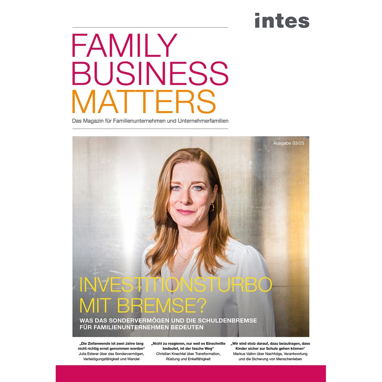 Die aktuelle Family Business Matters ist jetzt online abrufbar. 500 Milliarden Euro für Verteidigung und Infrastruktur: Was bedeutet das für die Zukunft der Familienunternehmen? Genau darum geht es in der neuen Ausgabe unseres INTES-Magazins Family Business Matters! In Zeiten großer Umbrüche steht auch die Welt der Familienunternehmen vor neuen Fragen: Was bedeutet das neue Sondervermögen? … Weiterlesen …
