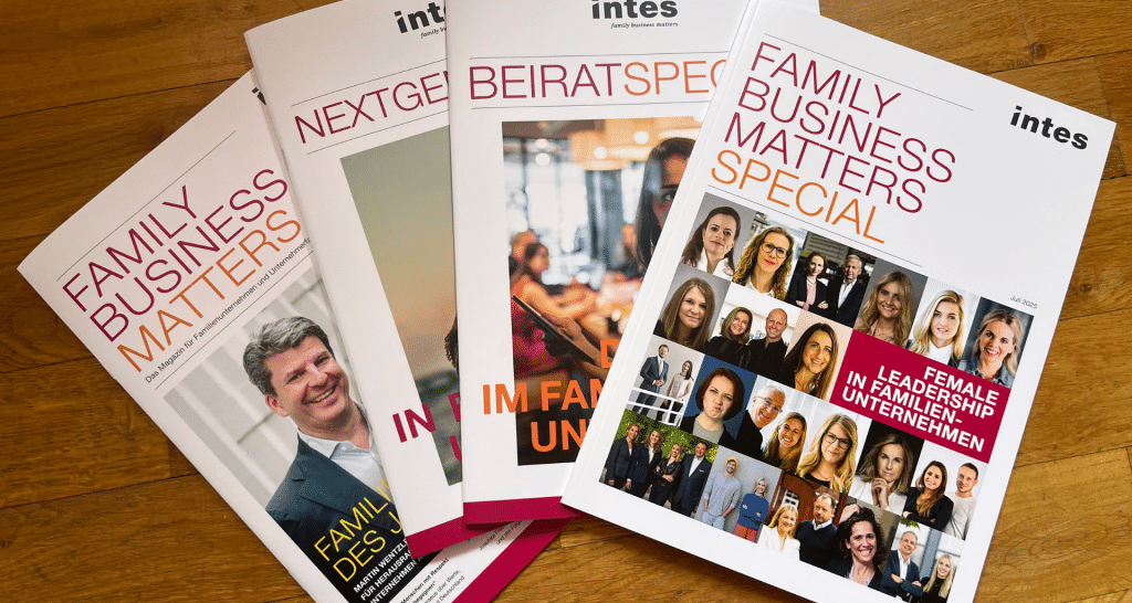 Hier finden Sie eine Übersicht der INTES Publikationen. Dazu zählen Studien, unser Magazin Family Business Matters, sowie Specials zu den Themen Beirat, NextGen und Leadership.