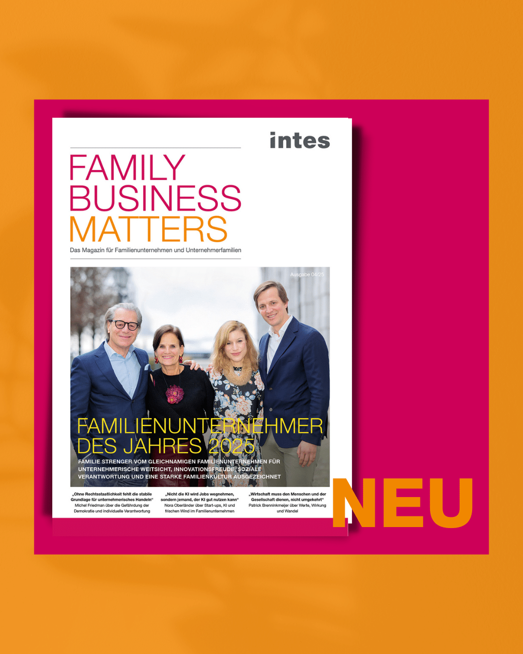 Das IN­TES-Magazin ist das Must-Read für Fa­mi­li­en­un­ter­neh­men und Un­ter­neh­mer­fa­mi­li­en. Vier­mal im Jahr er­hal­ten Sie span­nen­de Ein­bli­cke in die Welt der Fa­mi­li­en­un­ter­neh­men, be­kom­men Im­pul­se und prak­ti­sche Tipps rund um Stra­te­gie und Um­set­zung, Fa­mi­ly Go­ver­nan­ce, Nach­fol­ge und Ver­mö­gen. Überzeugen Sie sich selbst.